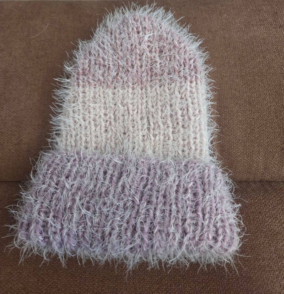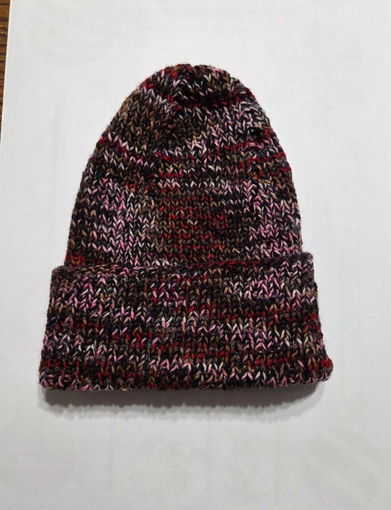 Here’s a second hat I finished This was for my soon-to-be daughter-in-law. This yarn is Caron Latte Cakes – Lovely Layers (in one of the purple shades), and it was so soft I had to switch to my KnitPicks rainbow wood needles to keep it from sliding around. I cast on 60 stitches (her head measured 22 inches) using size 8 circular needles and just worked one-by-one rib all the way to the top. Same basic pattern as mine, just fluffier and a bit smaller. Super cozy!