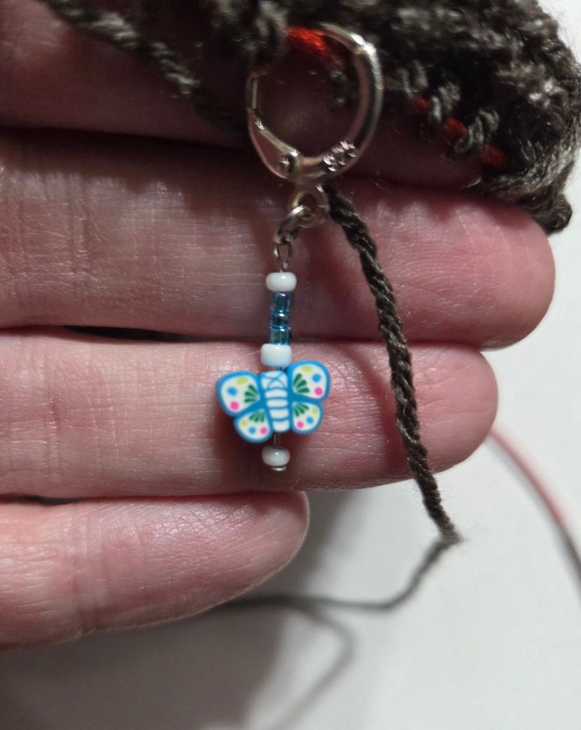 The stitch marker I’m using is one I made using a little polymer clay butterfly bead that I got from Amazon. I love the clasp style because it’s round and fits over larger needles easily.