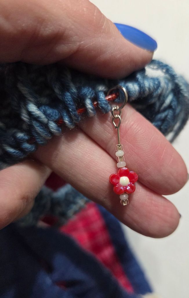 I’m keeping it in one of the first project bags I ever made. And that little flower stitch marker? I made it too! I love those beads and haven’t been able to find more like them. I got them in a random stash from a thrift store.