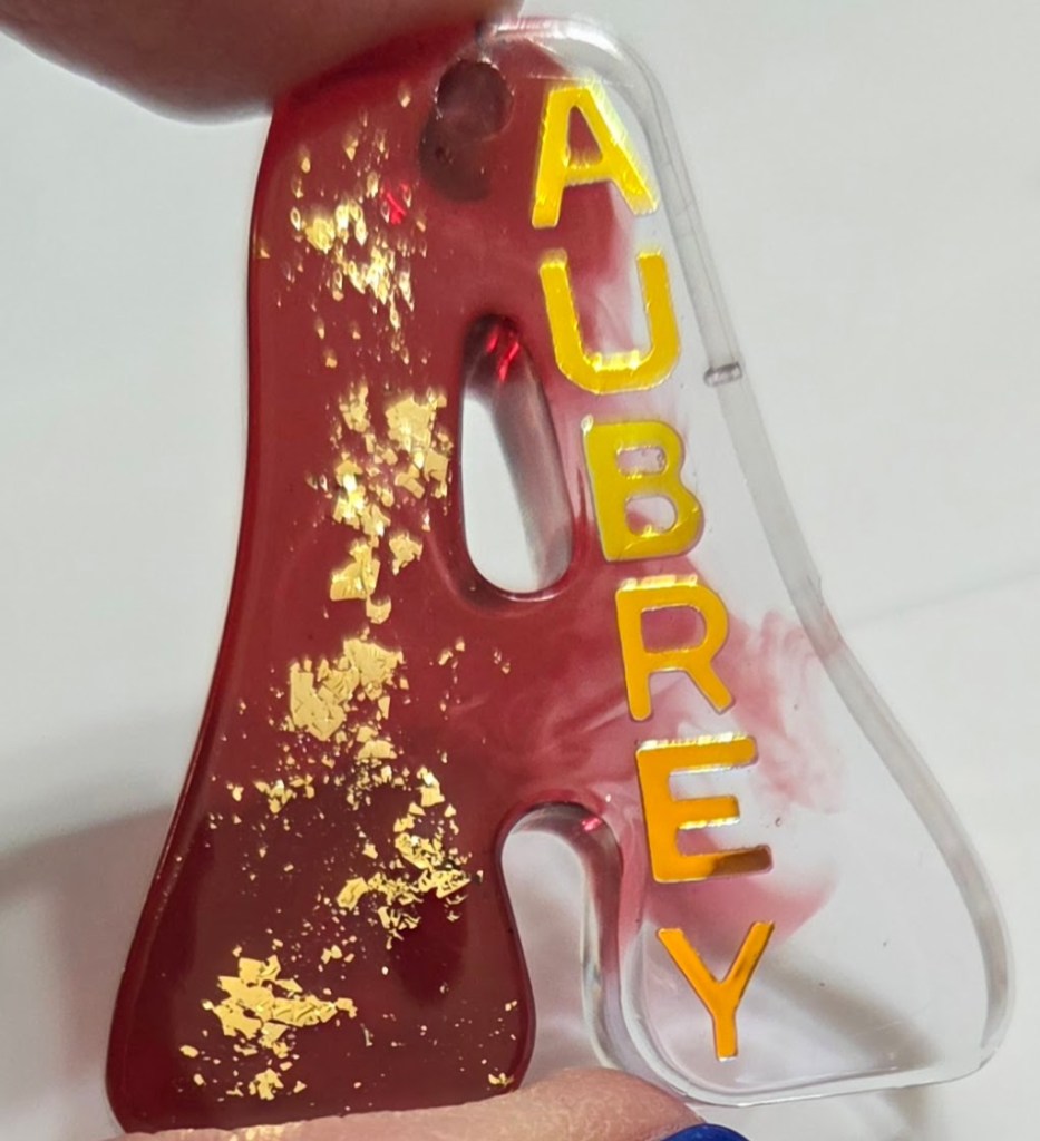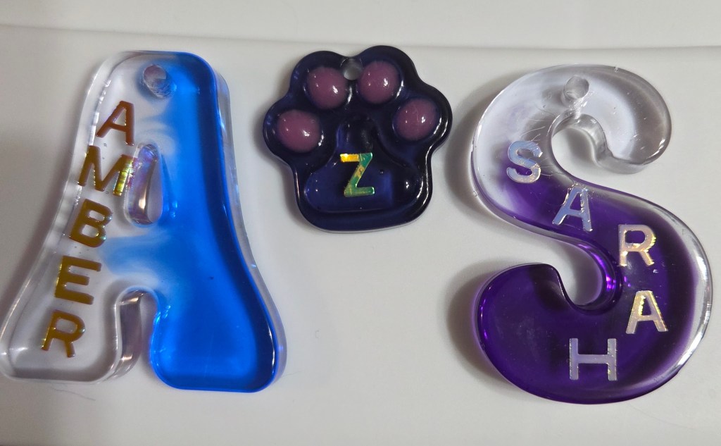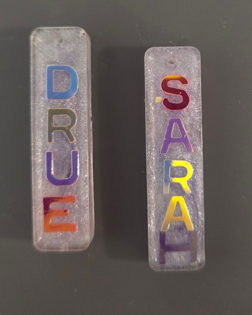 I saw the tube of alphabet glitter at Hobby Lobby—just one of those “Ooh, that would be fun in resin” moments. I decided to try using the letters to make earrings. Long rectangle molds, some resin, and little letters floating inside like magic. I made a pair for Sarah—one earring with her name, the other with Drue’s. They turned out so pretty.
