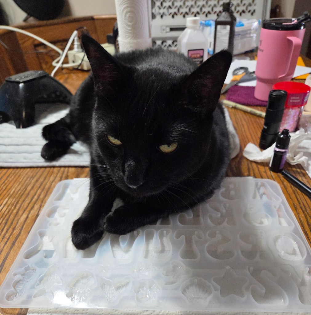 And on the same mold tray, there was a paw print. So I made one of those too. Black resin, pink toe beans, and a letter Z in the center—for Zazu, Zuri, Zephyr, and Zorro. All black cats, all names starting with Z. The design worked exactly how I pictured it, and I stopped there. I didn’t want to mess up a perfectly good pour day.
