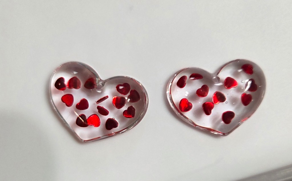 So I got creative. I poured a super thin clear layer of resin and cured it. Then, one by one, I placed the red hearts with tweezers, added another thin layer of resin, and cured it again. Then I did it all over one more time.