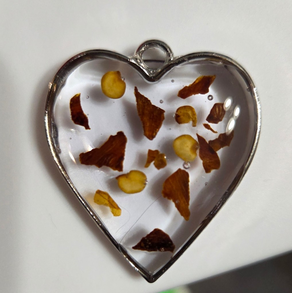 I decided to use hearts for the pepper flakes—seemed appropriate for Valentine’s Day. Everything looked great at first, until the bubbles started showing up. They’d been hiding under the tea and pepper flakes, then rose up under the UV lamp. One of the hearts came out near perfect—except when I tried to dome it, it overflowed. The second heart had a couple of bubbles—still beautiful—but when I domed that one, it overflowed just enough to fill the ring at the top. I’ll drill that out later.